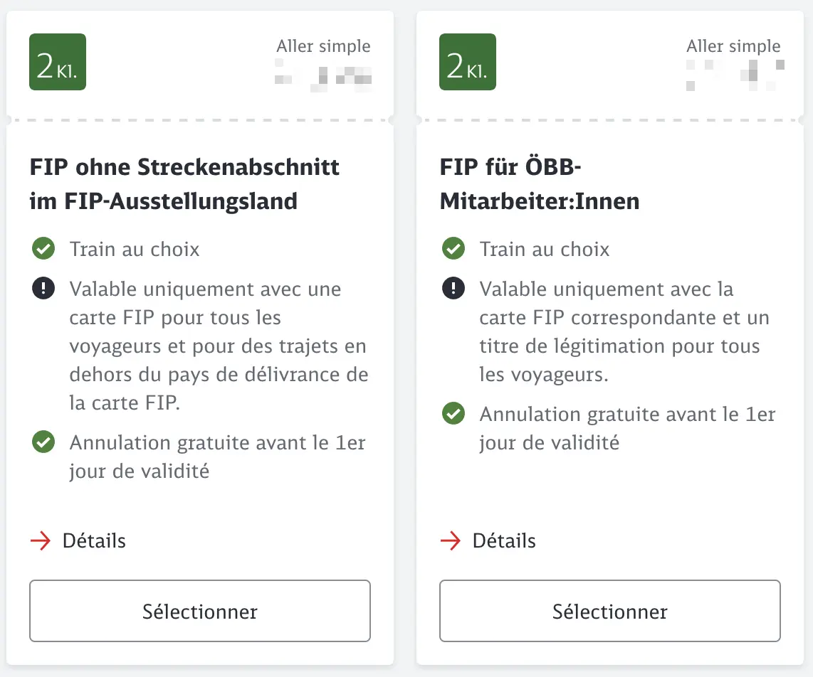 Il est recommandé de vérifier à nouveau le prix en état non connecté avant l’achat pour savoir si le prix FIP 50 a effectivement été calculé. Avec certaines compagnies ferroviaires, il y a eu des calculs de prix incorrects dans le passé sans la réduction FIP 50.
